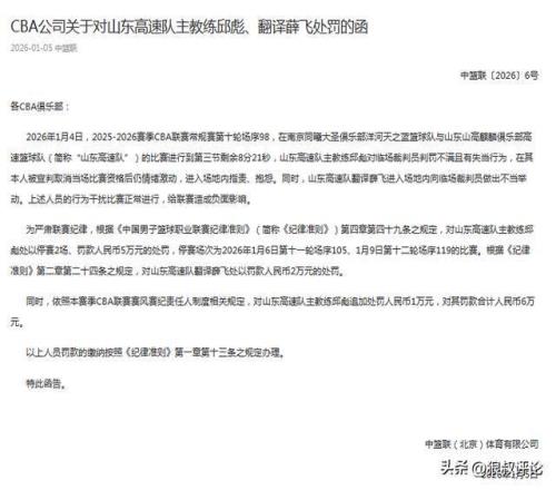 为严肃联赛纪律,根据《中国男子篮球职业联赛纪律准则》(简称《纪律准则》)第四章第四十九条之规定,对山东高速队主教练邱彪处以停赛2场、罚款人民币5万元的处罚,停赛场次为2026年1月6日第十一轮场序105、1月9日第十二轮场序119的比赛。根据《纪律准则》第二章第二十四条之规定,对山东高速队翻译薛飞处以罚款人民币2万元的处罚。
